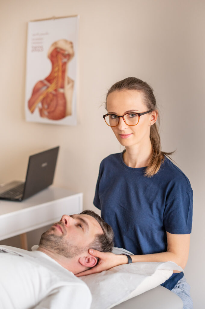 Na pierwszej wizycie fizjoterapeutka przeprowadza dokładny wywiad oraz ocenę funkcjonalną. Sprawdza postawę, napięcie mięśni, zakres ruchu w odcinku szyjnym oraz ewentualne objawy współtowarzyszące, np. szumy uszne, zawroty głowy czy zgrzytanie zębami.
